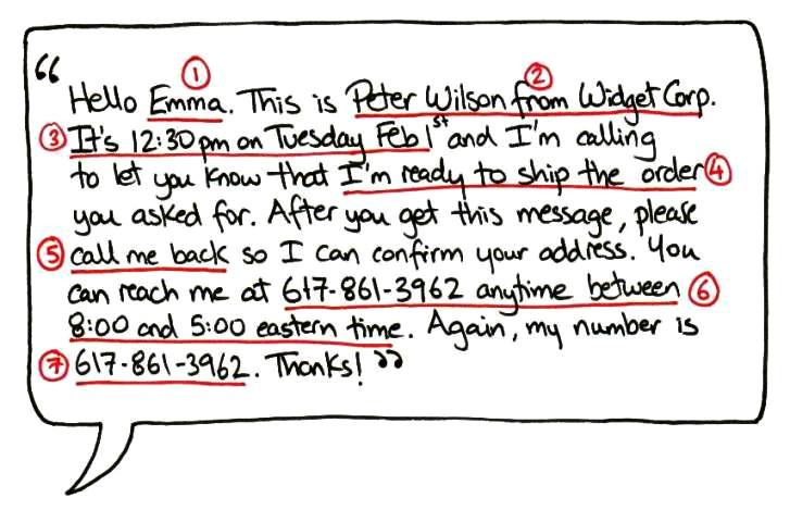 If you run your own business or manage a team, you probably leave more than a handful of voice messages each day on your clients’ or colleagues’ phones. To make sure that you communicate your message clearly and minimize any miscommunication, you’ll want to make sure you craft the perfect voice message. Here’s a sample with the 7 parts you’ll need: